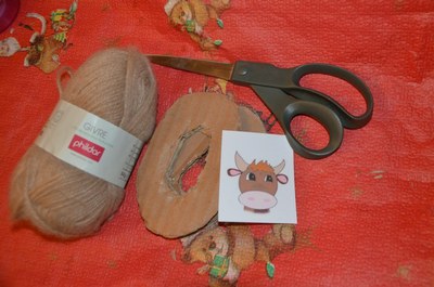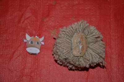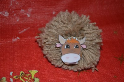 Attacher un bout de carton au fil qui a servi à tenir le pompon et coller l'image du boeuf dessus.