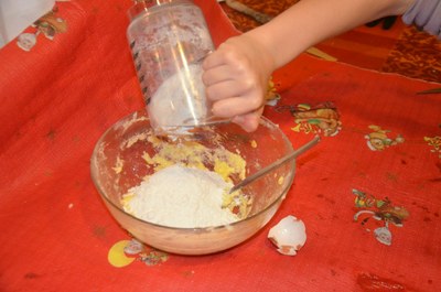 Puis incorporer la farine, les amandes, les écorces d'oranges, les épices, le sel pour parfumer.