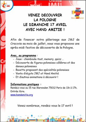 Afin de financer notre pèlerinage aux JMJ de Cracovie au mois de juillet, nous vous proposons une après-midi festive de découverte de la Pologne.
