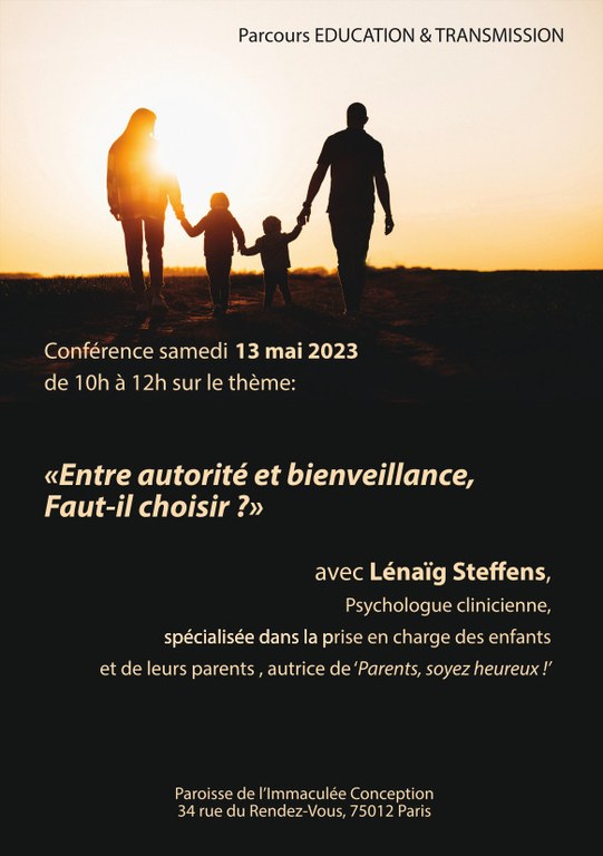 Dans le cadre du parcours EDUCATION et TRANSMISSION, cette première conférence, qui veut nous rappeler le souci éducatif pour apprendre et transmettre aux enfants nos fondamentaux, sera suivie d'autres sur la façon d'aider les enfants à choisir leur vie, à les aider à faire face aux erreurs des addictions, ou encore à voir dans la vie d'aujourd'hui et par l'exemple parental une joie venue du Christ.