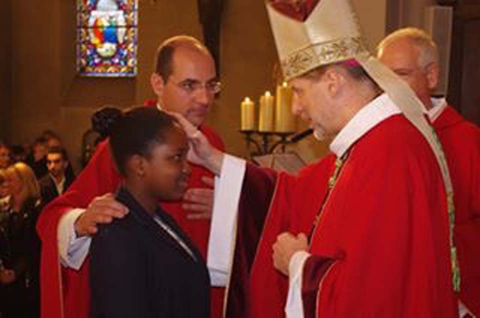 Le second, l’onction du Saint-Chrême (c’est la même huile parfumée que celle reçue lors de notre baptême). L’évêque trace une croix sur le front du confirmand avec cette huile sainte pour signifier que l’Esprit-Saint sera toujours avec lui pour l’aider à connaître Dieu et à l’aimer toujours davantage : « Sois marqué de l’Esprit-Saint, le don de Dieu ». En recevant ce sacrement ces jeunes ont signifié leur désir de cheminer à la suite du Christ, de devenir à leur tour de véritables témoins de Dieu dans le monde.