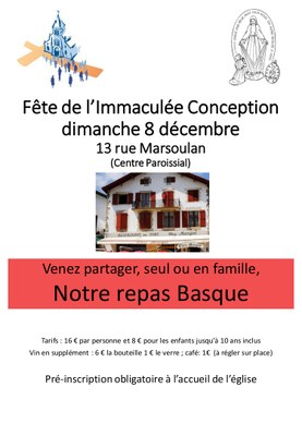 Venez partager, seul ou en famille, notre repas Basque. Pré-inscription obligatoire à l’accueil, dès à présent (adultes: 16 € ; enfants jusqu'à 10 ans inclus : 8 € ; le vin sera payant sur place, et une corbeille sera disponible pour accueillir vos dons). L'inscription est obligatoire (DATE LIMITE DIMANCHE 1er DECEMBRE). -> Fiche d'inscription à imprimer compléter et déposer à l'accueil